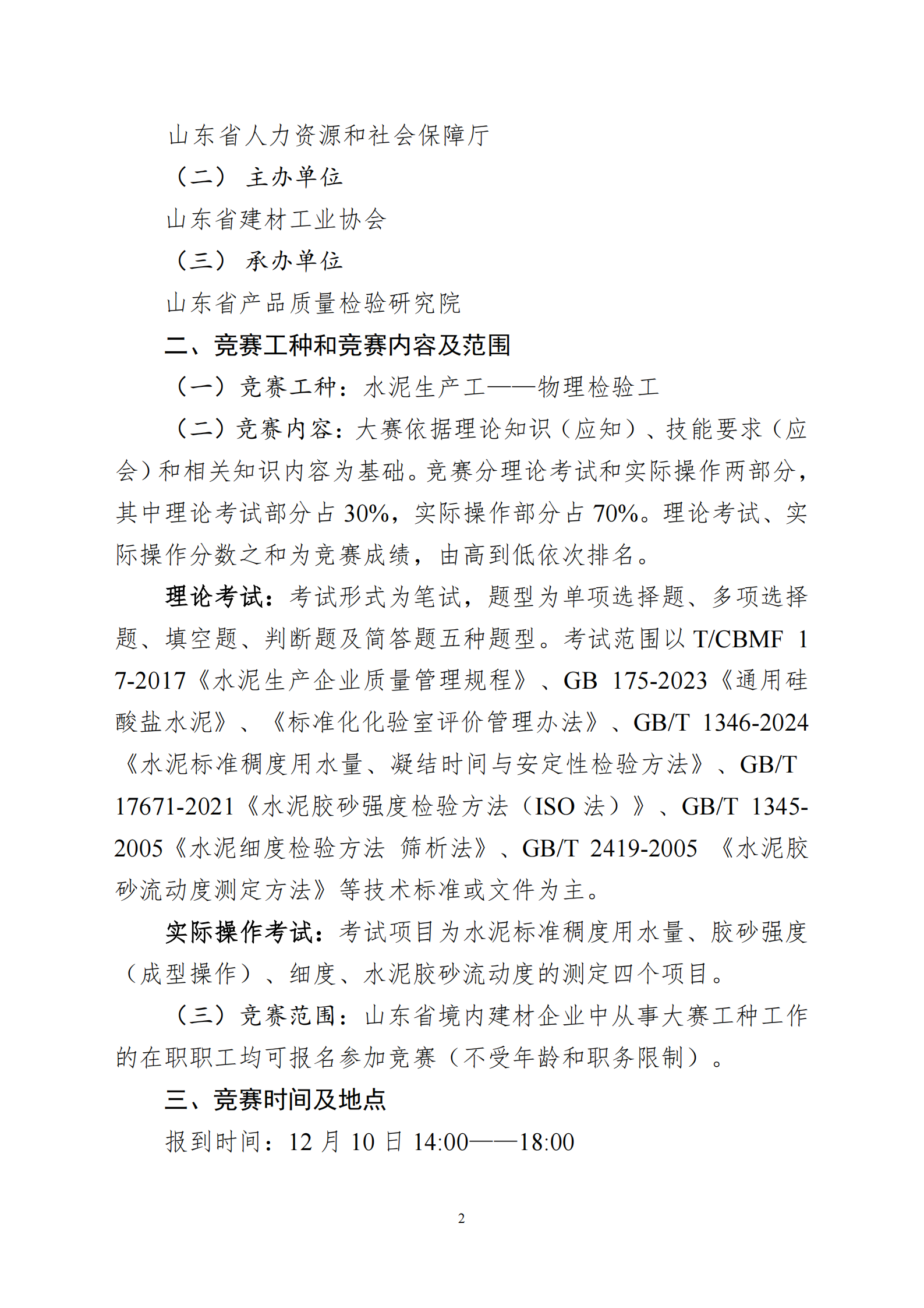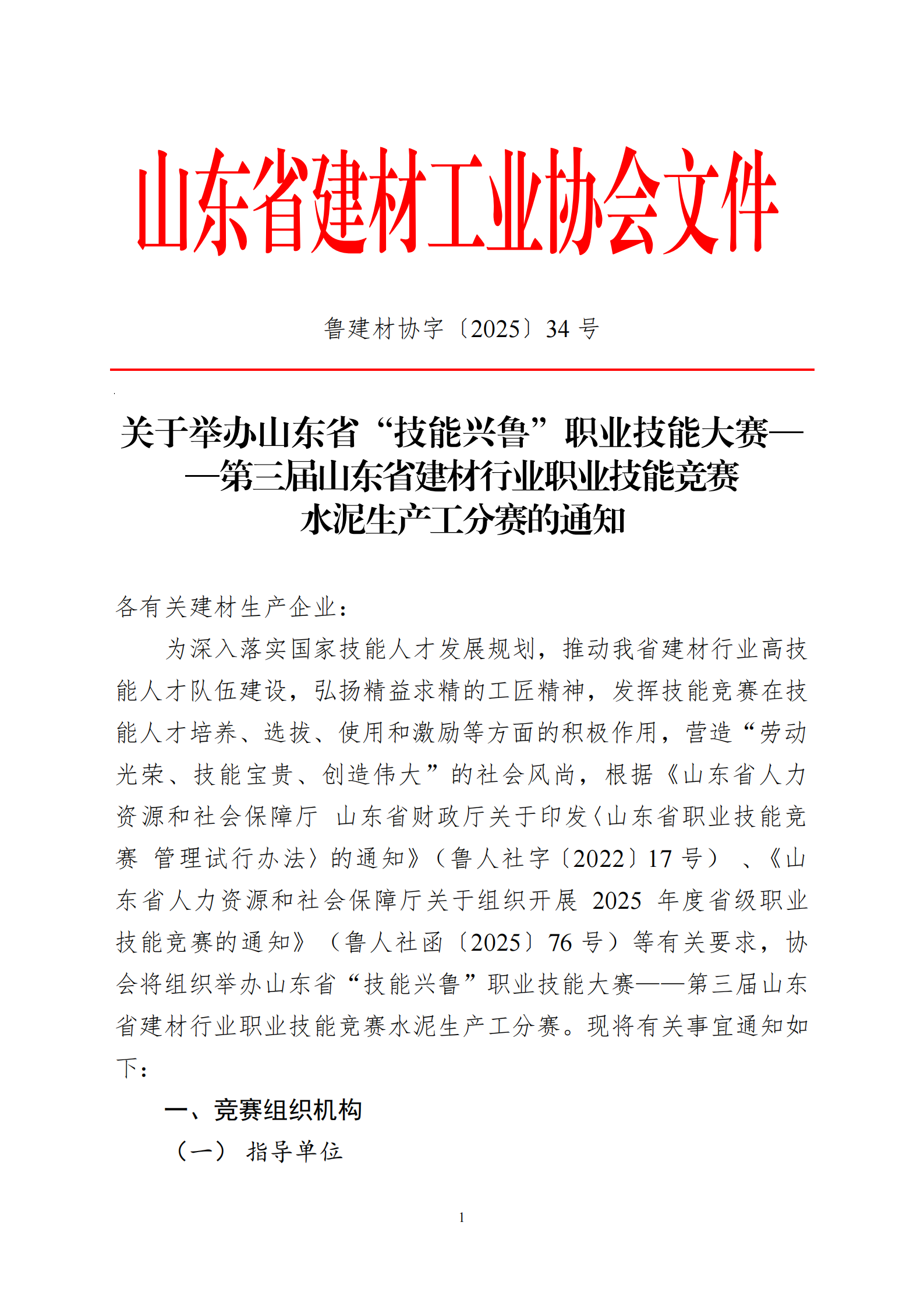 魯建材協(xié)字〔2025〕34號關(guān)于舉辦山東省“技能興魯”職業(yè)技能大賽——第三屆山東省建材行業(yè)職業(yè)技能競賽水泥生產(chǎn)工分賽的通知